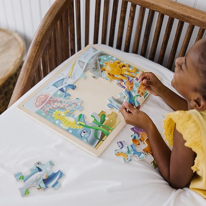 Puzzle play is an exceptional way for children to develop cognitive, physical, and emotional skills. As children work at solving the decorative and themed puzzles, they also develop hand-eye coordination along with fine and gross motor skills. Problem-solving and logical thinking are also vital life-development skills that children learn by playing with Melissa & Doug puzzles. The Melissa & Doug Under the Sea Jigsaw Puzzle is an exceptional gift for kids ages 3 to 5 years. Add the Melissa & Doug Dinosaurs 4-in-1 Puzzle to round out the hands-on, screen-free play experience.